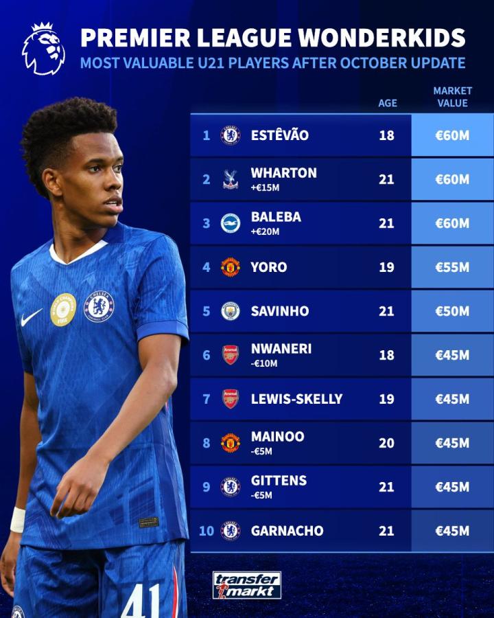在英超球员身价全面更新后,德国转会市场网站震撼发布U21球员身价TOP榜,埃斯特旺、沃顿和巴莱巴以6000万欧的超高身价傲视群雄,稳居榜首!